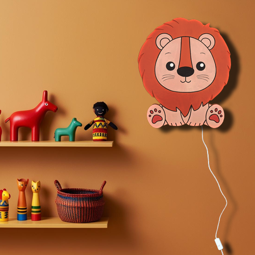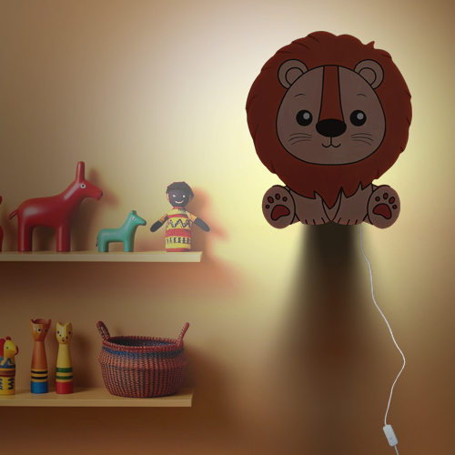 Drvena zidna lampa ambijentalnog osvetljenja i kablom dužine 2m sa prekidačem. Ručno farbana ekološkim bojama koje poseduju sertifikat za bojenje igračaka za decu. Opremljena jakim metalnim držačem i osigurana od povlačenja kabla i blagih udaraca zbog bezbednosti dece.